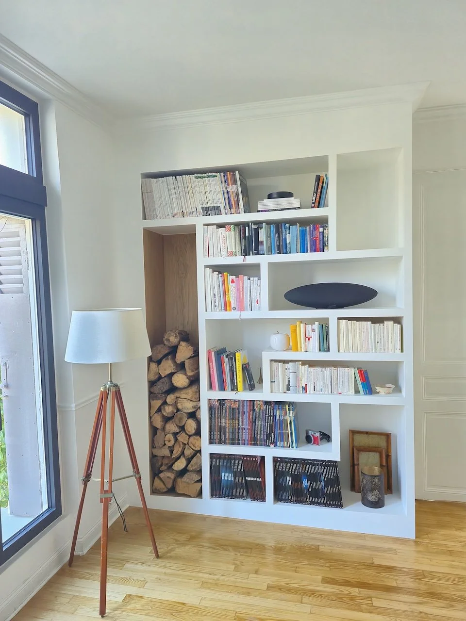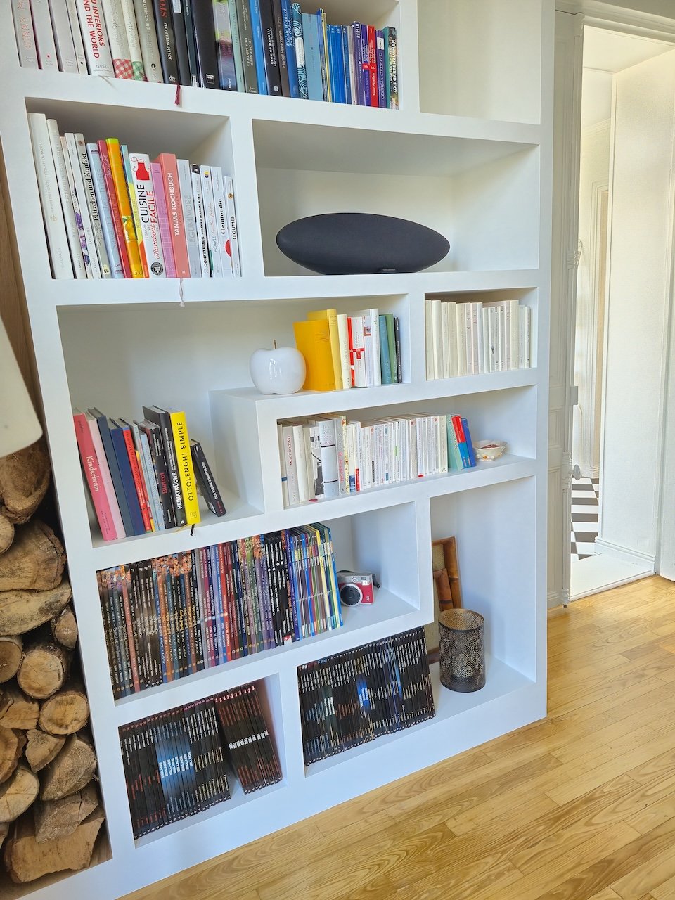 Voici un bel exemple de conception sur mesure, entièrement pensée à partir de l’utilisation du client. Cette bibliothèque réponds parfaitement aux besoins du client qui était de concilier rangement de buches et de livres ainsi que équipements audio. Avec des prises électriques posées dans le fond des niches cette bibliothèque il est possible d’y brancher enceintes sono et lampes. Les parois du bucher sont en chêne massif permettant d’y ranger le bois pour la cheminée sans risquer d’endommager la peinture avec le temps et ainsi préserver la qualité des finitions dans le temps. Le reste de la bibliothèque et conçu en MDF peint en blanc. Les côtés de la bibliothèque ont été entièrement découpés pour s’ajuster parfaitement avec les murs existants et ainsi offrir une transition invisible pour un rendu final très haut de gamme.
