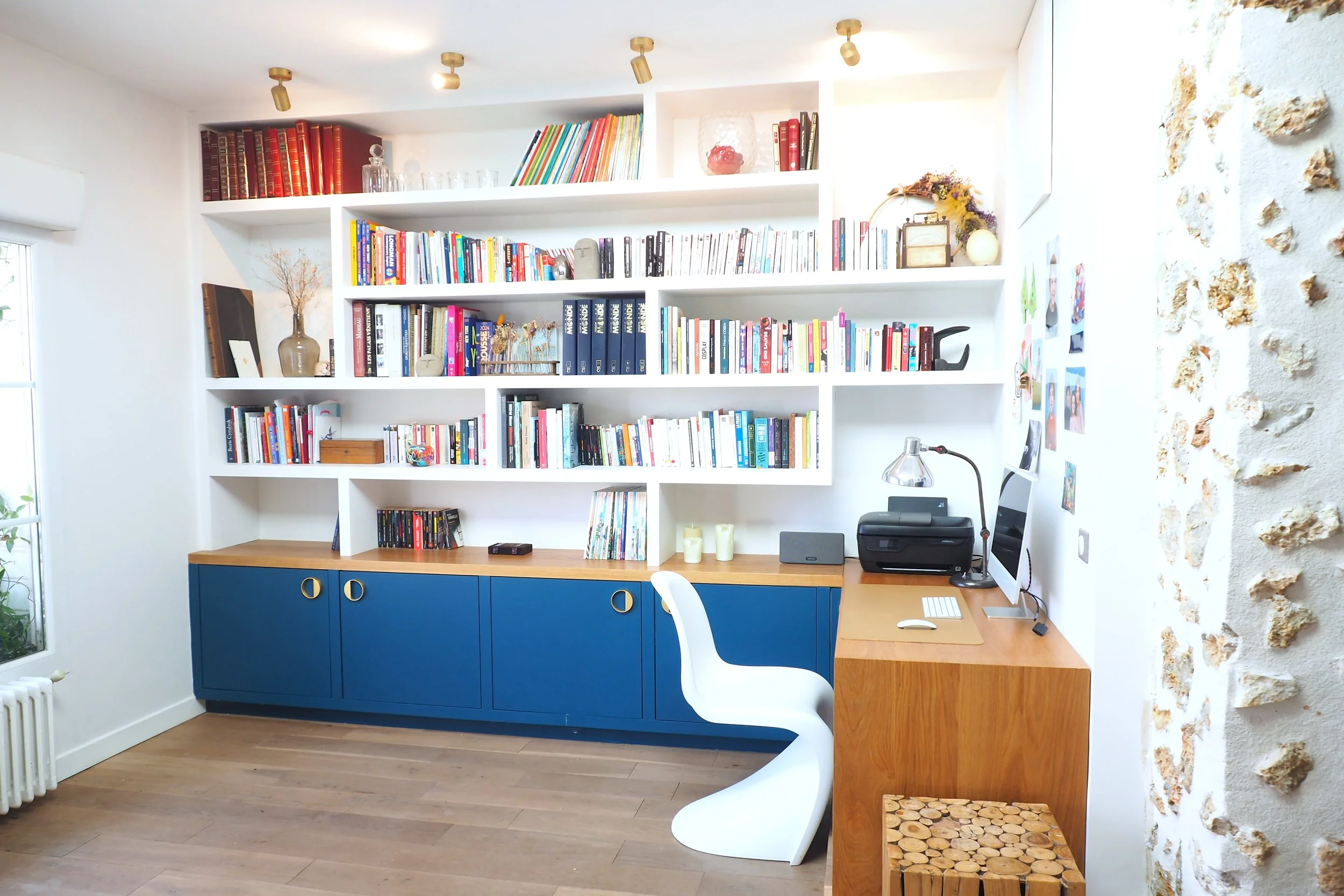Pour répondre à un double besoin de marier espace de rangement et bureau pour le télétravail j’ai conçu cette bibliothèque pour permettre à mon client de disposer d’un espace de travail ouvert et accessible, combinant rangement fermé et bibliothèque ouverte. Le dessin des étagères à permis d’occuper le mur tout en l’étirant visuellement. J’ai également intégré la contrainte de l’imprimante dont le couvercle peut-être manipulé pour scanner les documents sans avoir à la déplacer.
