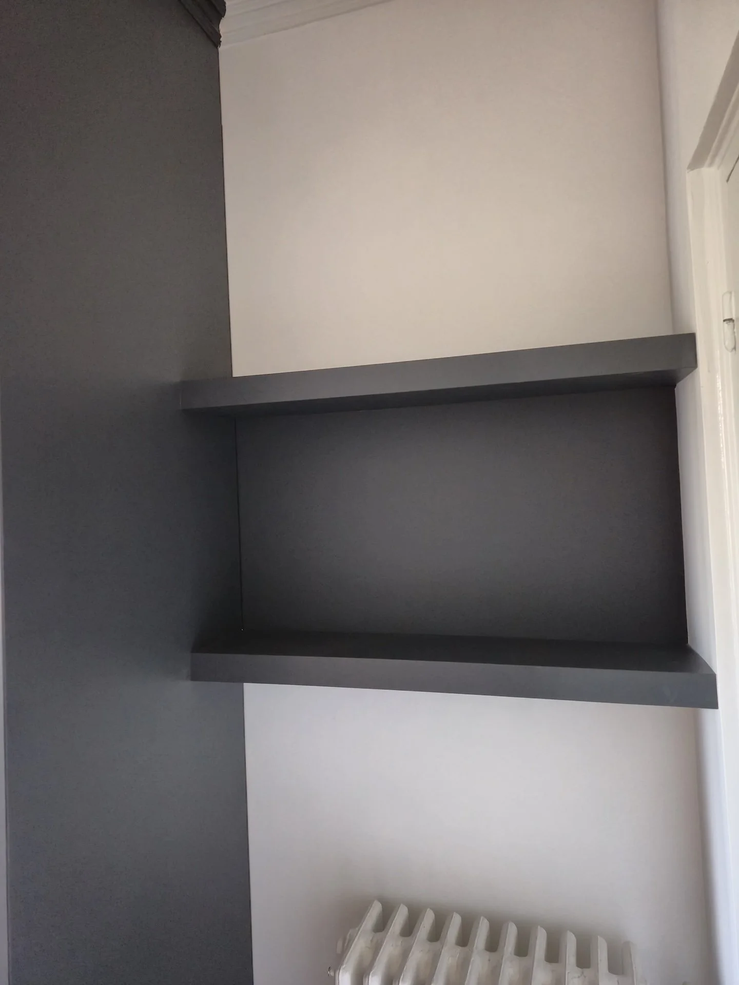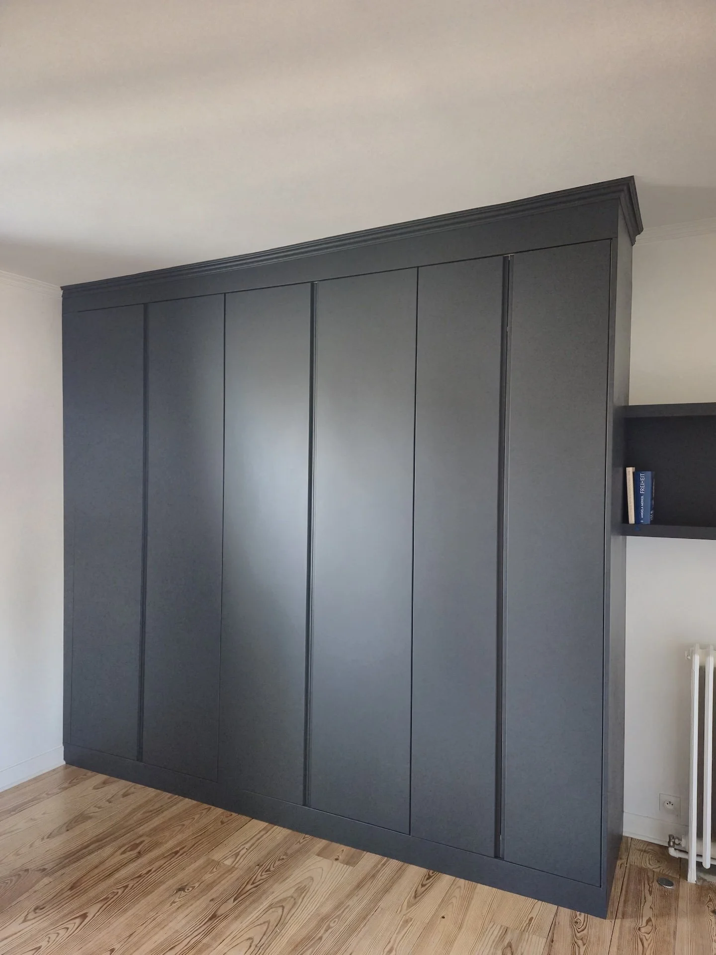 Beau dressing sur mesures avec ajout de tablettes à fixation invisibles. Les côtés du dressing ont été ajustés sur place pour permettre un intégration parfait malgré les murs penchés. les portes réalisées en MDF ont été peinte à la teinte choisie par le client. En lieu et place de poignées j’ai usiné dans l’épaisseur un titre doigt pour un résultat épuré. Pour rentrer dans la contrainte budgétaire du client l’intérieur des caissons est réalisé en caissons PAX de chez IKEA.